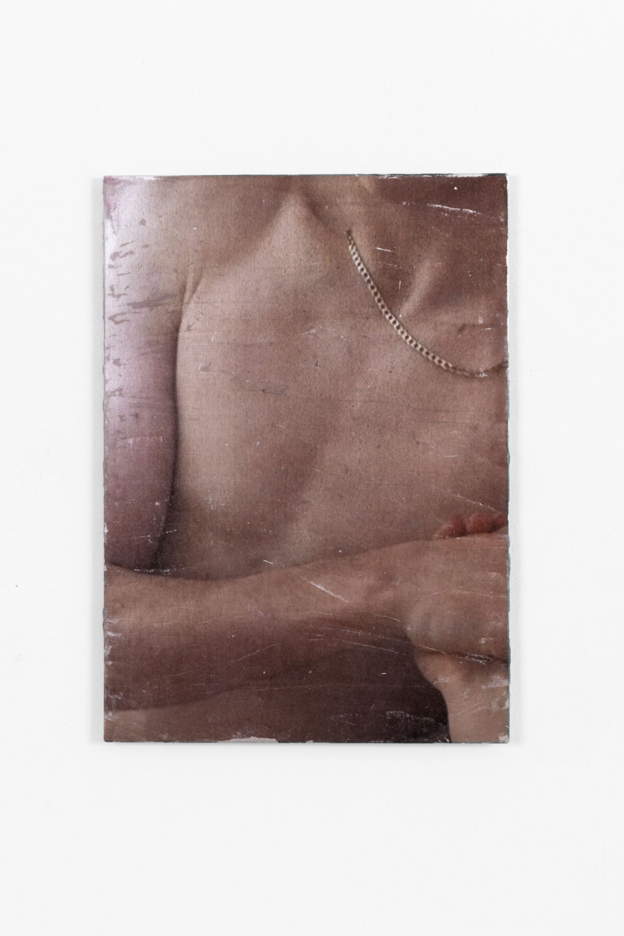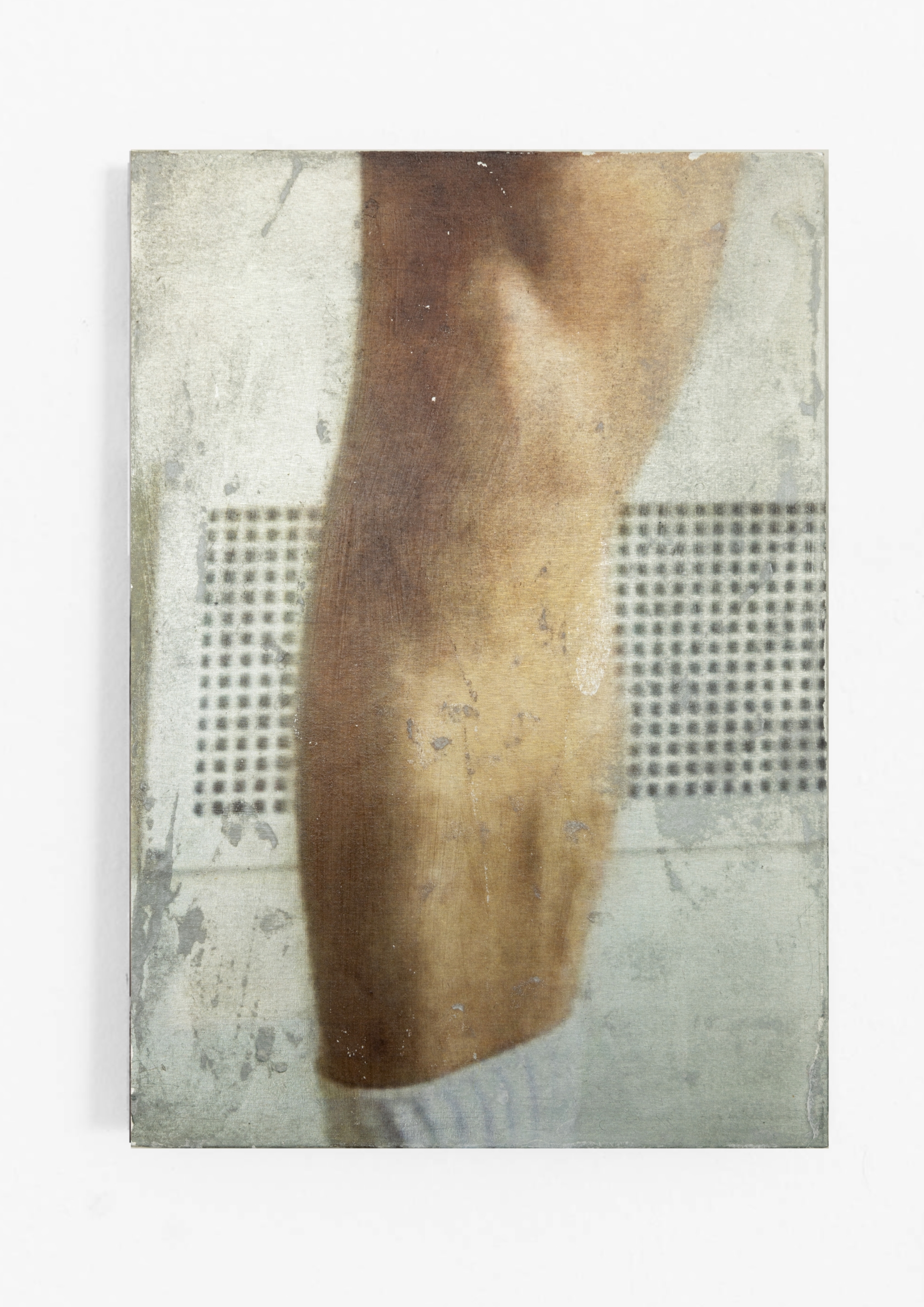 Knee, 2025, hand-transferred photograph on aluminium, 26 x 18 cm |