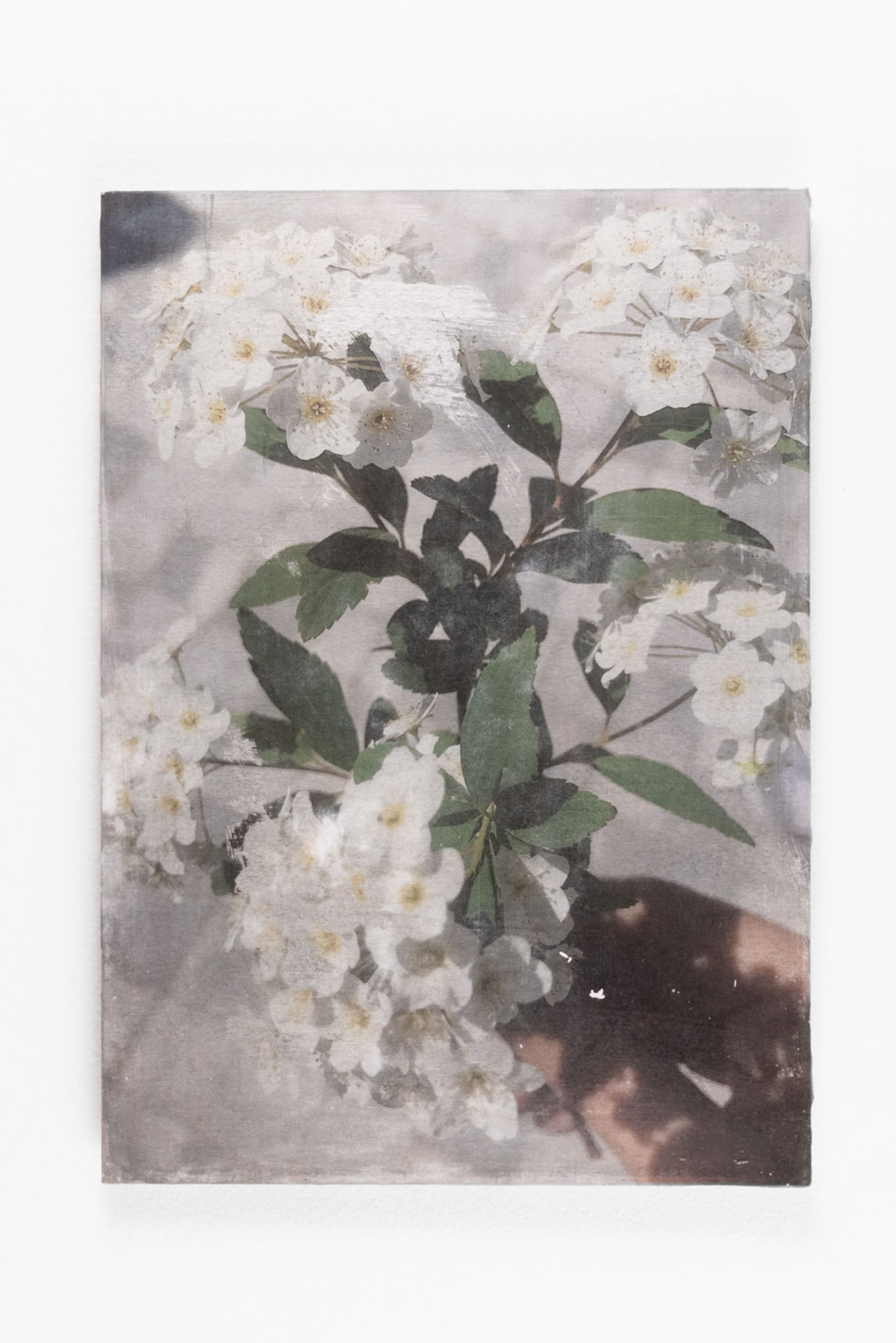 White Flowers, 2025, hand-transferred photograph on aluminium, 35 x 25 cm |